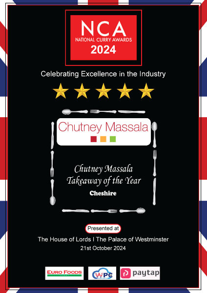 Honoured by the National Curry Awards, presented by Lord Mayor of Westminster Cllr Robert Rigby and MP Esther McVey at The House of Lords. A testament to our family's dedication and love for serving exceptional cuisine.